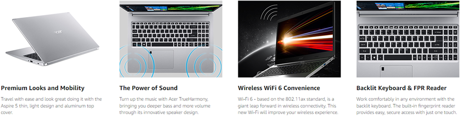 Acer Aspire 5 A515-54-59W2 comes with these high level specs 10th Generation Intel Core i5-10210U Processor 1 6GHz with Turbo Boost Technology up to 4 2GHz (6MB Smart Cache) Windows 10 Home 15 6" Full HD (1920 x 1080) widescreen LED-backlit IPS Display Intel UHD Graphics 620 8GB DDR4 Memory 256GB PCIe NVMe SSD True Harmony Technology Two Built-in Stereo Speakers Acer Purified Voice Technology with Two Built-in Microphones Acer Fingerprint Reader supporting Windows Hello Intel Wireless Wi-Fi 6 AX201 802 11ax Dual-Band 2 4GHz and 5GHz featuring 2x2 MU-MIMO technology (Max Speed up to 2 4Gbps) 10/100/1000 Gigabit Ethernet LAN (RJ-45 port) Bluetooth 4 2 Back-lit Keyboard HD Webcam (1280 x 720) 1 - USB 3 1 (Type-C) port (Gen 1 up to 5 Gbps) 2 - USB 3 1 Gen 1 Port (one with Power-off Charging) 1 - USB 2 0 Port 1 - HDMI Port with HDCP support Lithium-Ion Battery Up to 9 5-hours Battery Life 3 97 lbs | 1 8 kg (system unit only) (NX HN3AA 003).