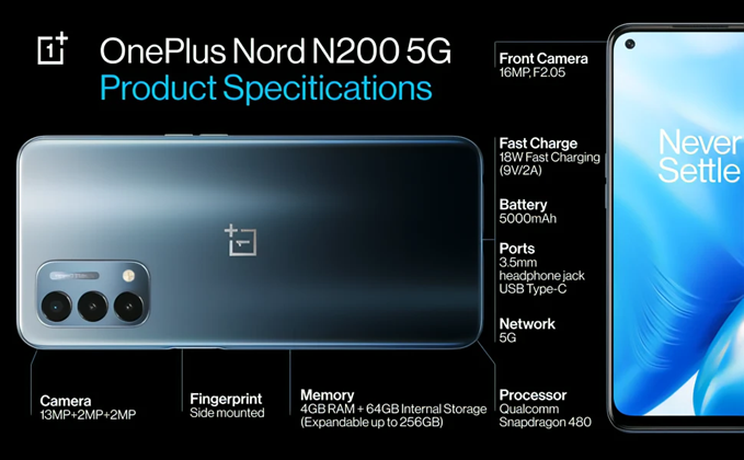 - 4GB RAM + 64GB built-in storage (expandable up to 256GB) - The OnePlus Nord N200 5G packs all the performance power and storage you’ll need to run and store your favorite content. 4GB of RAM ensures your applications and content run smoothly, making for a seamless, customizable, and enjoyable mobile experience. The 64GB of built-in storage ensures you can have all your favorite films, TV shows, games, and photos with you on the go. Need more storage? Expand it by up to 256GB with a microSD card.
