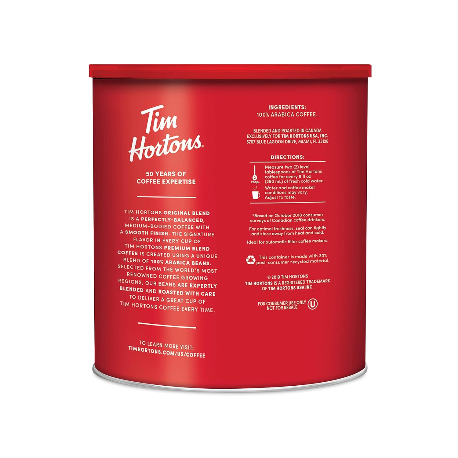 Tim Hortons Original Blend, Medium Roast Ground Coffee, Canada’s Favorite Coffee, Made with 100% Arabica Beans, 48 Ounce Canister