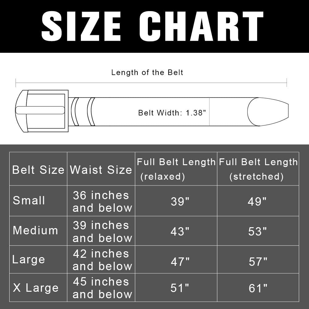 • Q: How long are these mens belt? How do I choose the elastic belt that suits my waistline? LENGTH OF MENS BELT: 39in (100cm)-49in (130cm), recommended for waist size under 36 inches./ 43in (110cm)-53in (135cm), recommended for waist size under 39 inches./ 47in (120cm)-57in (145cm), recommended for waist size under 42 inches./ 51in (130cm)-61in (155cm), recommended for waist size under 45 inches.
