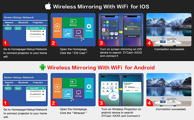 1. Turn on your wifi projector, go to setup page to connect your projector with your home wifi;