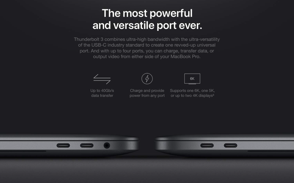 Charging and ExpansionTwo Thunderbolt 3 (USB-C) ports with support for: Charging, DisplayPort, Thunderbolt (up to 40 Gbps), USB 3.1 Gen 2 (up to 10 Gbps)