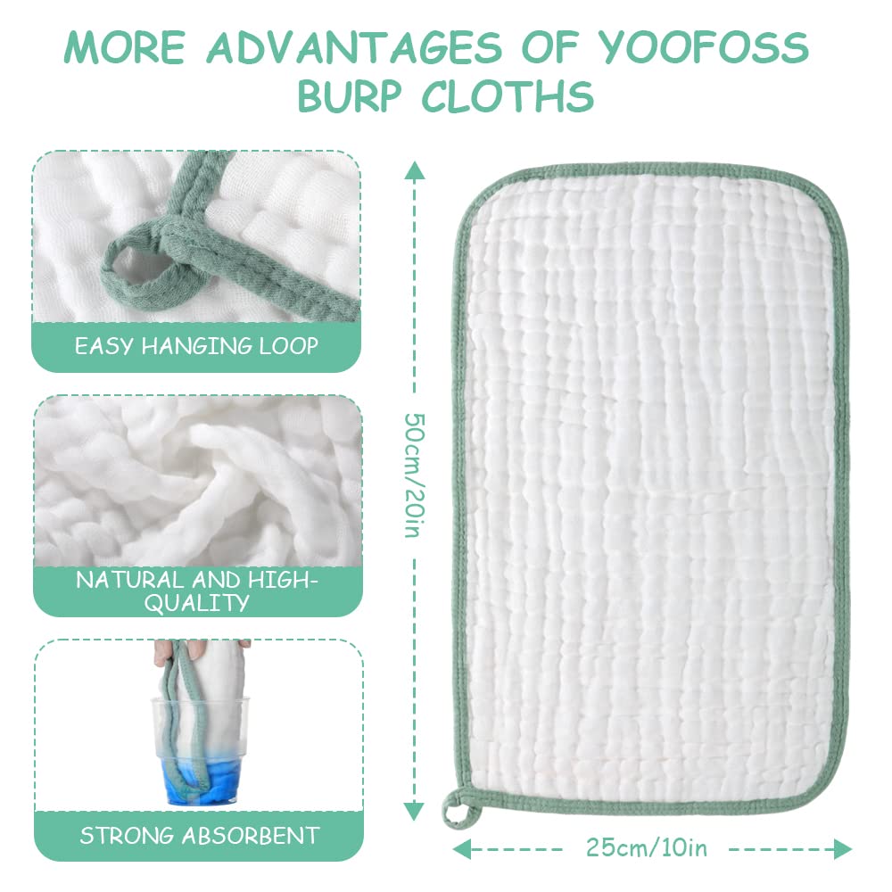 SOFT AND ABSORBENT: The fluffy structure of muslin burp cloths provides a comfortable and breathable effect. Large 20''X10'' size provides maximum coverage, absorbs drools and spills in seconds, keeping cloths dry and comfy.