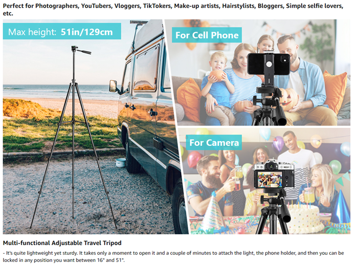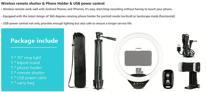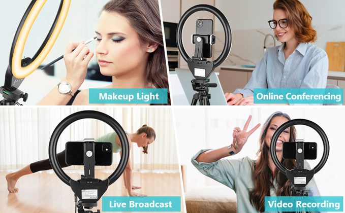• 【Versatile Accessories】 The USB-powered control helps protect your safety while improving the ring light’s brightness. The phone holder is spring-loaded and extends up to 5.3" wide, it is compatible with almost ALL smartphones with or without a case.