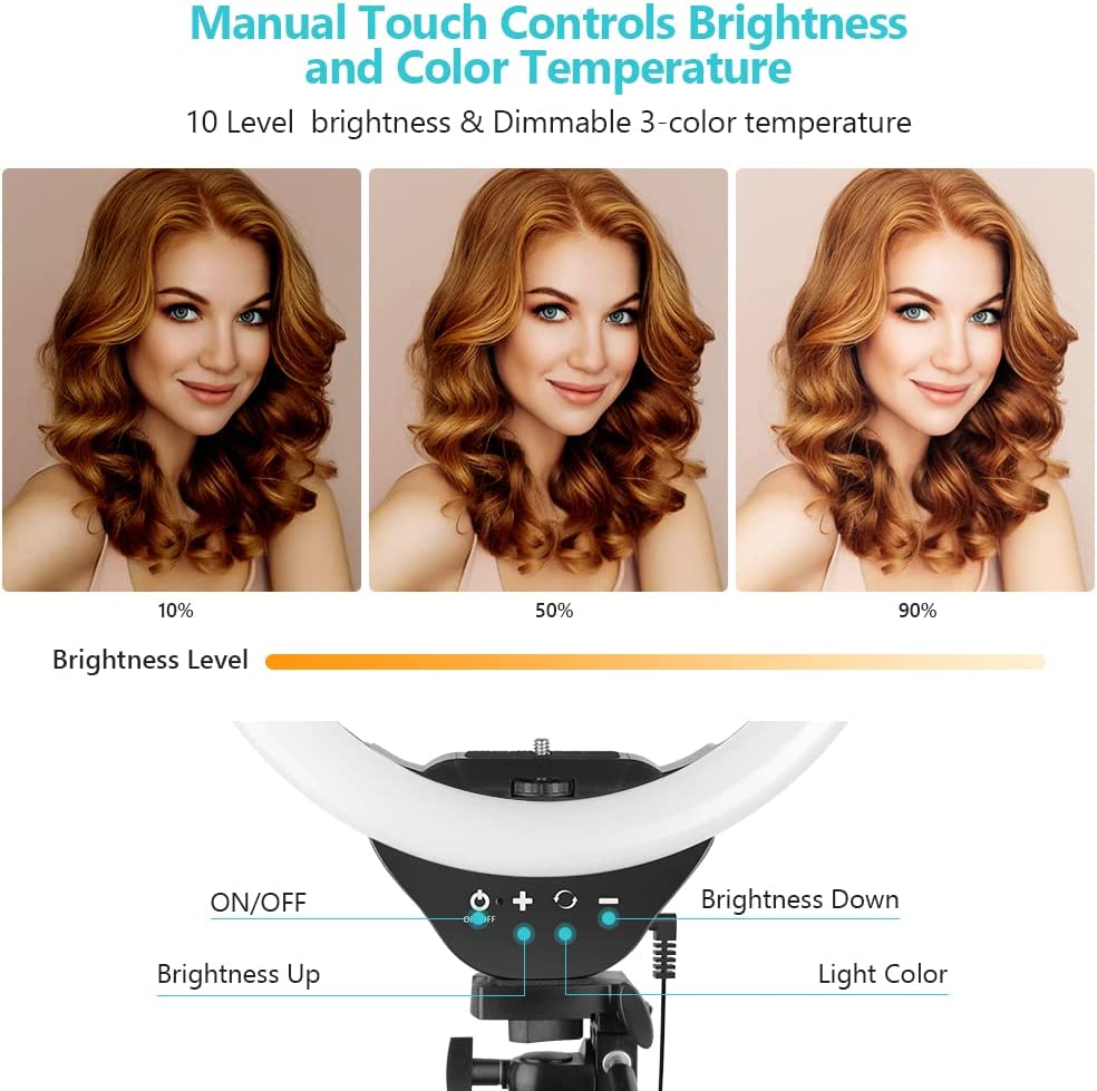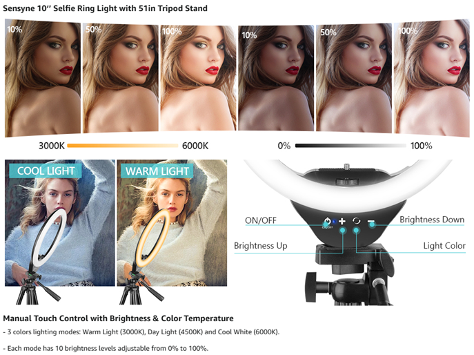 • 【High Brightness & Clever Touch Control】Sensyne selfie ring light features a high sensitivity touch panel design that has a longer life than traditional mechanical buttons. It provides full control to easily adjust the 3 color modes (cool white, warm yellow and daylight) and 10 brightness levels to meet your different needs. Perfect for Photographers, YouTubers, Vloggers, TikTokers, etc.