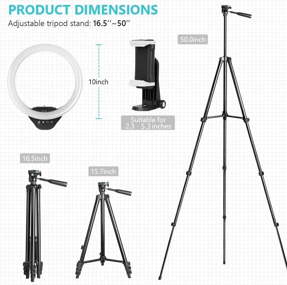• 【Fully customizable portable tripod Stand】 Extending from 15.7 inches to 50 inches, our tripod can be adjusted to any height within seconds as needed, short enough to stand on tabletop, tall enough to fit your height. This compact circle light set comes handy when you do makeup, artworks, beauty & fashion live streaming, video calls and more.
