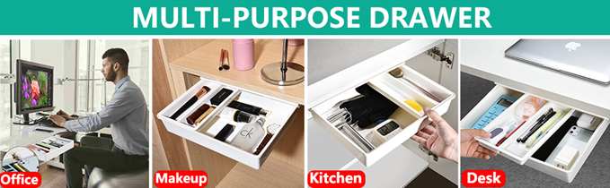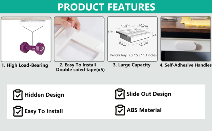 - 【Large Capacity】Entire drawer for under desk is 10.2"D x 13.4"W x 2.8"H, it can store various of items, such as ipad, phone, pens, pencils, glue, erasers, adapters, headphones, cutlery, cosmetics or other small, regularly used items.