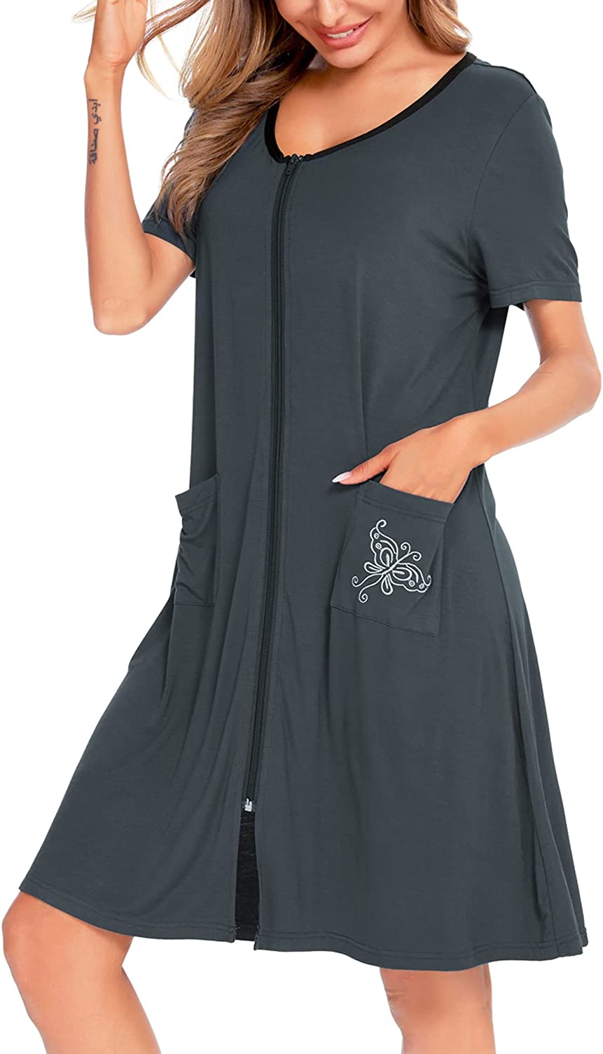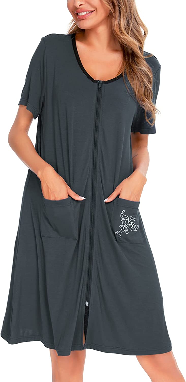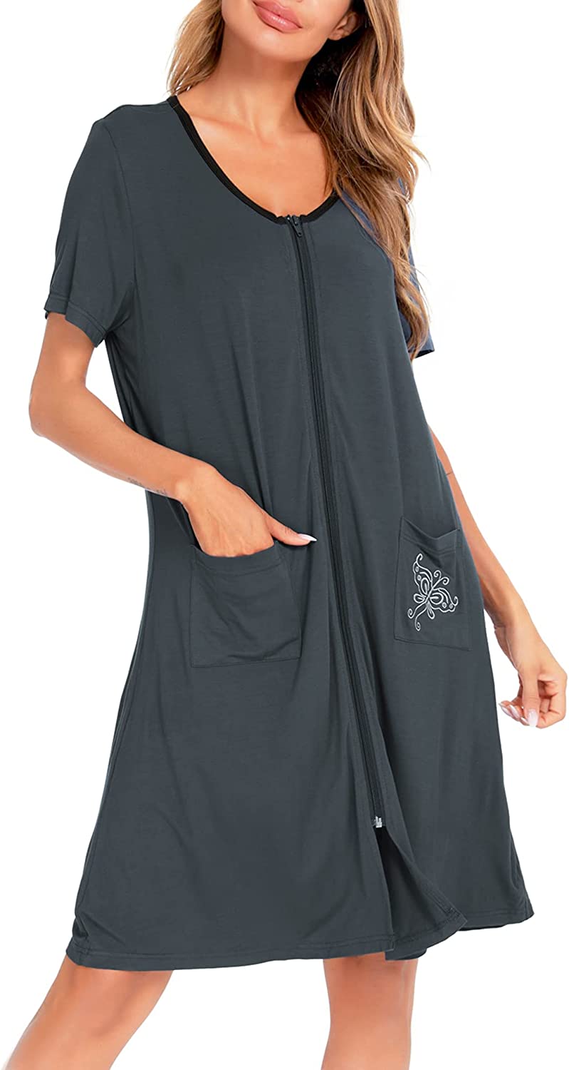 SWOMOG Women's Zip Up Housecoat Zipper Front Robe Lightweight Bathrobe Short Sleeve Loungewear Nightgowns with Pockets