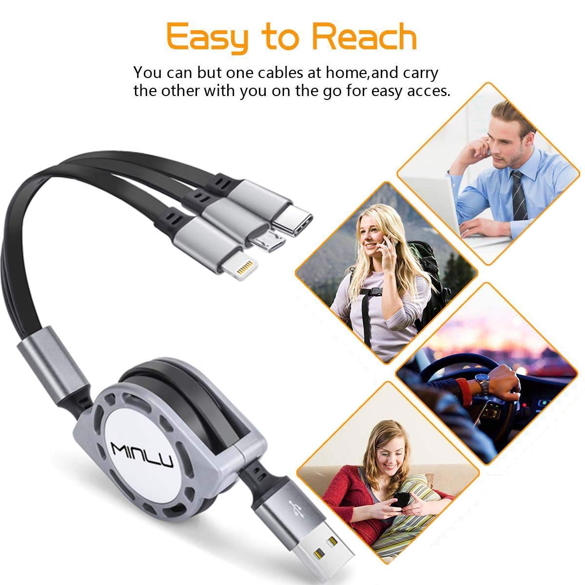 ● 4Ft/120cm is perfect length for long distance charging, 3-in-1 retractable design, makes the cord portable and only need one cable when you are on a business trip or traveling.