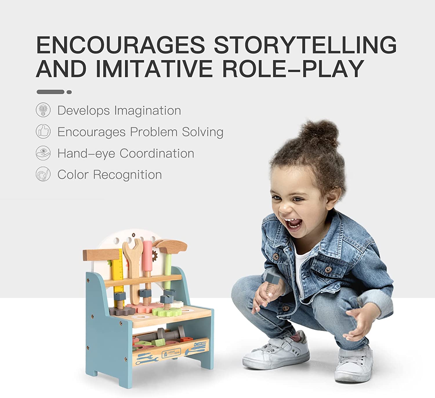 ROBUD Mini Wooden Play Tool Workbench Set for Kids Toddlers - Construction Toys Gift for 18 Months 2 3 4 5 Years Old Boys Girls
