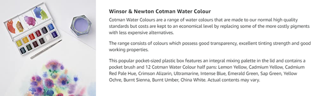 • Winsor & Newton Cotman Water Colors are made to our high quality standards but costs are kept to an economical level by replacing some of the more costly pigments with less expensive alternatives