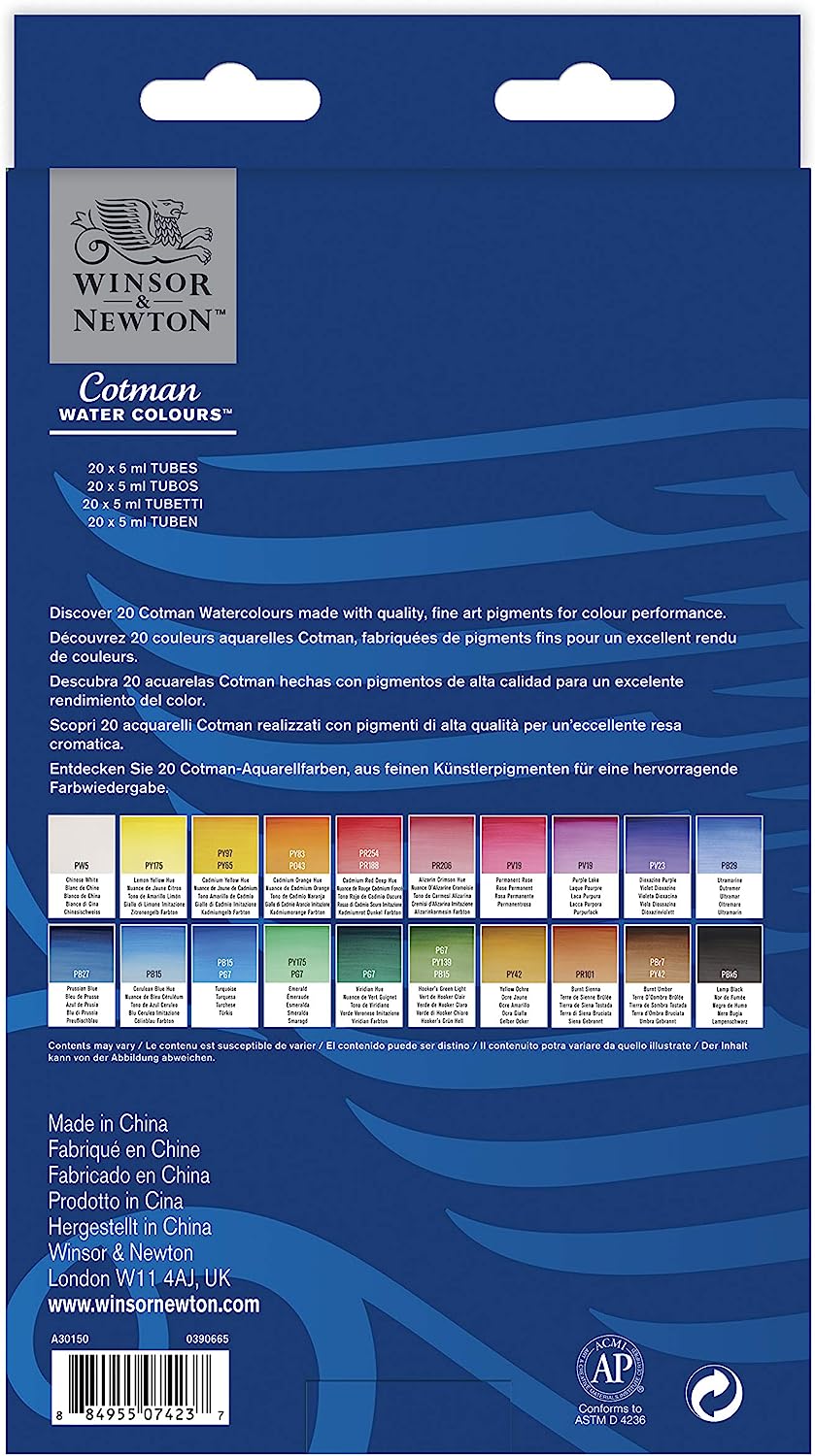 • This set contains 20 essential starter colors for beginners. Cotman colors are formulated for high transparency and provide outstanding lightfastness. For specific effects use with Winsor & Newton watercolor mediums.