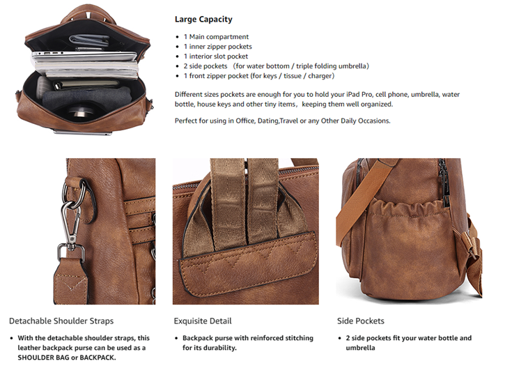 • 【DIMENSIOIN & WEIGHT】:(L)13.50" x(W) 6.25" x (H) 14.25", Weight: 2.09 LB; removable strap is 12.11".The Large designer leather backpack allows you to fit items easily.