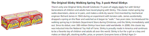 There’s only one Original Slinky Brand! Celebrate 75 years of wiggly-jiggly fun with Slinky! Generations of children and adults have loved playing with Slinky. This classic metal spring toy walks downstairs, alone or in pairs, and makes a slink-ity sound. First invented by mechanical engineer Richard James in 1943 during an experiment with tension coils. James accidentally dropped a spring on the floor and watched as it began to “walk.” Two years later, he introduced his walking spring toy in Gimbels Department Store during Christmas, and the Slinky immediately sold out. Since its debut, over 300 million Slinkys have been sold worldwide. In 2000, this classic toy was inducted into the National Toy Hall of Fame. Made 75 years ago, Slinky continues to be a favorite toy of children and adults all over the world. Slinky is fun for a girl or a boy and makes an ideal gift, stocking stuffer, prize, or present. Everyone loves a Slinky! Ages 5+.