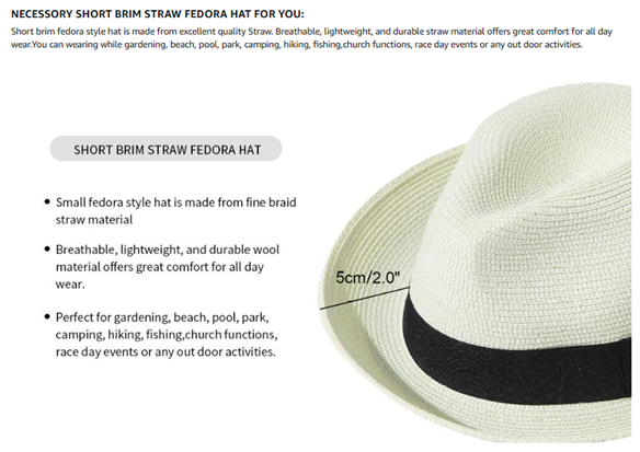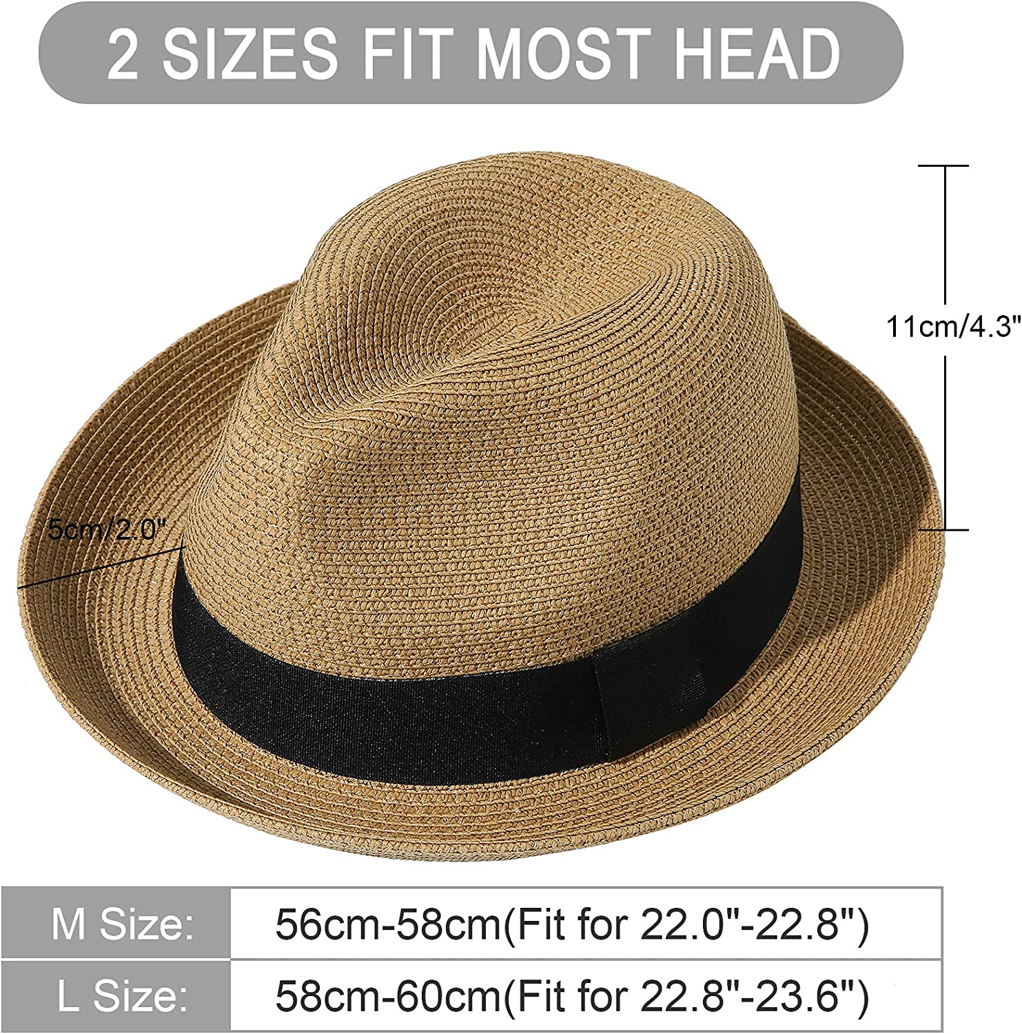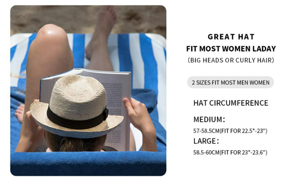 • Available in two sizes, our Straw Fedora Hat is designed to fit most head sizes. The Medium Size 57-58.5cm (Fit for 22.5"-23") and Large Size 58.5-60cm (Fit for 23"-23.6") provide a perfect fit for both men and women.