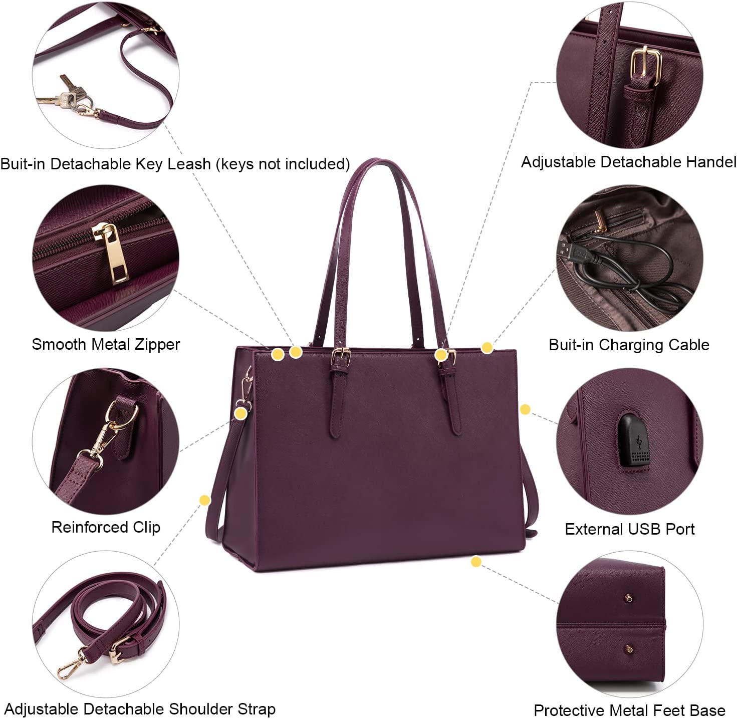 LOVEVOOK Laptop Bag for Women, Fashion Computer Tote Bag Large Capacity Handbag, Leather Shoulder Bag Purse Set, Professional Business Work Briefcase for Office Lady, 2PCs, 15.6-Inch, Deep Plum