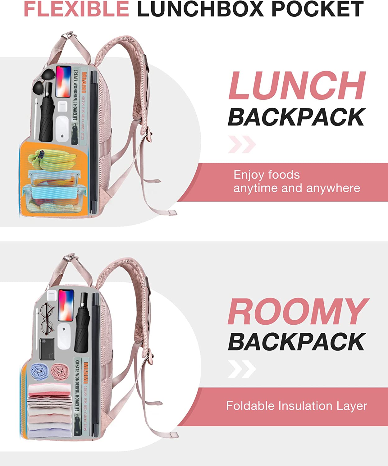 【ALL-IN-ONE BACKPACK】No more carry separate purse,laptop bag and lunch bag in work, travel or school! Simply together in one backpack. Multi-compartment backpack dedicated padded laptop compartment plus built in insulated cooler lunch box on the front, and wide open roomy main compartment for daily stuff. Dimensions: backpack:11.7”Lx 7”Hx 17.7”W, insulated cooler portion:11.7”L x 11”H x 5.5”D