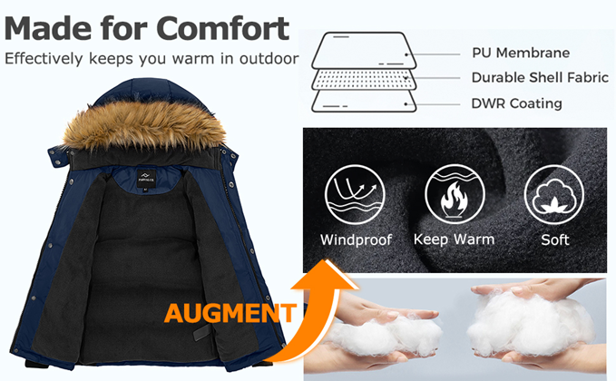 • Windproof Parka: (1) Elastic ribbed cuffs and removable fleece hood to seal in warmth in cold days. (2) Stand collar, a full zipper with button placket helps lock temperature.