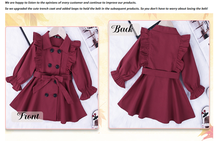 Feature: This baby girl's trench coat is button-down closure. Adjustable bow belt. Please notice that the jacket doesn’t have any belt loops to hold the belt. The tie around the waist is removable. You can also open it as a coat. Ruffle long sleeve. Elastic cuffs, Give your princess plenty of space to grow. Playful and adorable. Make your little girl adorable and charming, never out of style. A must-have for the princess autumn/winter wardrobe