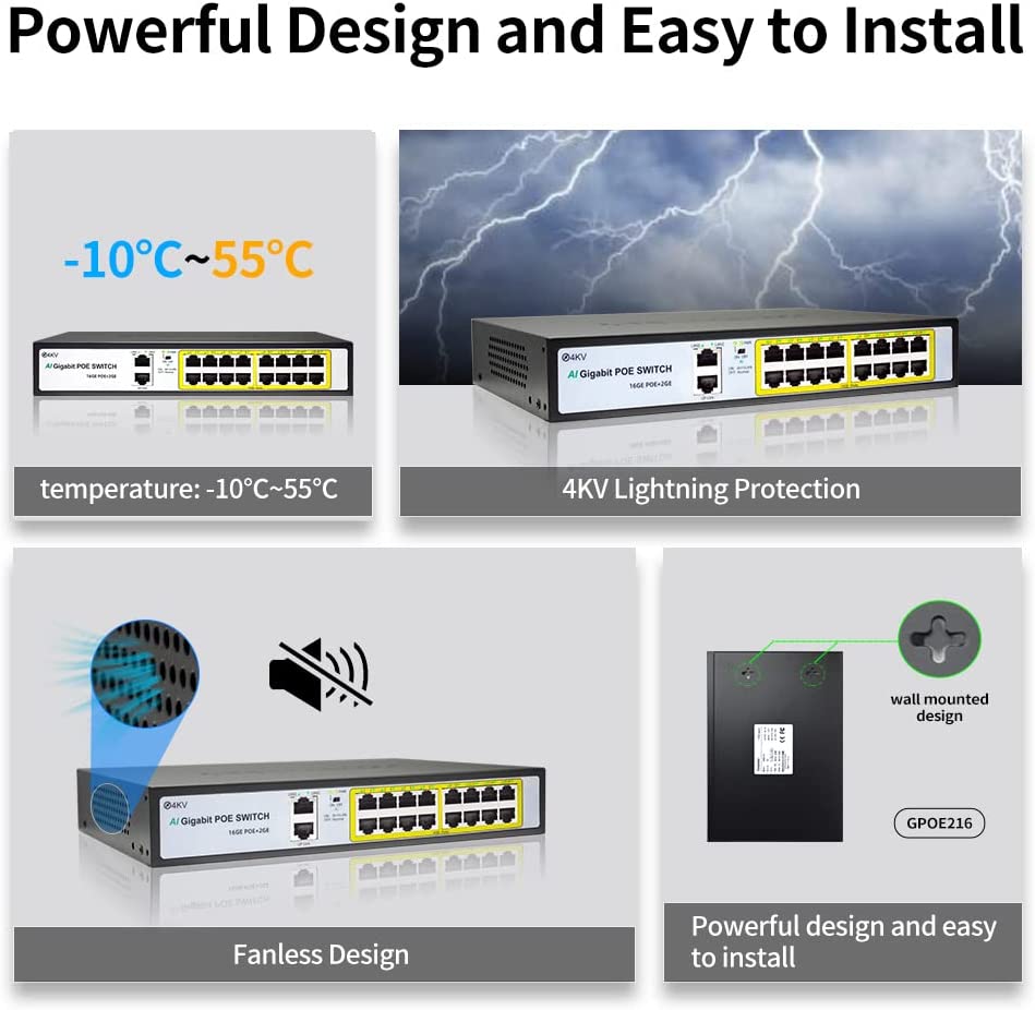 【18 Gigabit ports @240W 】16 Gigabit PoE ports +2*1000Mbps Uplink ports,Poe single port can provide up to 30W, total PoE budget 240W.