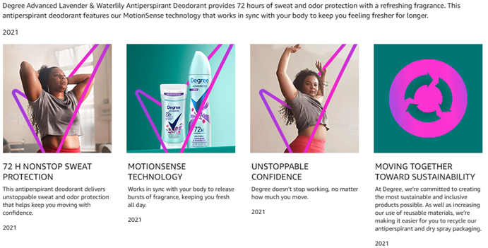 Degree Advanced Lavender and Waterlily Antiperspirant Deodorant lets you face the day with confidence. This antiperspirant for women features 72-hour sweat and odor protection and the relaxing, floral scent of lavender and waterlily. Only Degree has MotionSense technology that moves in sync with your body. This antiperspirant deodorant releases a burst of subtle fragrance every time you move, for nonstop protection. Degree Lavender and Waterlily deodorant for women keeps you feeling fresher, drier, and more confident. This powerful antiperspirant deodorant responds when you need it most, so you don't have to worry about slowing down. Simply swipe and start moving. This antiperspirant deodorant for women with a relaxing scent gives you the confidence to keep moving all day long. Degree Lavender and Waterlily Antiperspirant Deodorant keeps you feeling cool, fresh and protected from sweat and odor. Degree gives you the confidence to keep moving, however you move. Lavender and Waterlily also comes in an antiperspirant deodorant dry spray. At Degree, we’re doing everything we can to help keep the planet moving. That’s why we're increasing our use of reusable materials, making it easier for you to recycle our antiperspirant and dry spray packaging. Whatever you do, however you do it, Degree wants to help inspire the confidence in you to move more, and with this antiperspirant deodorant, it’ll provide you the confidence that sweat and odor will not get in your way of your progress. Degree. It won’t let you down.