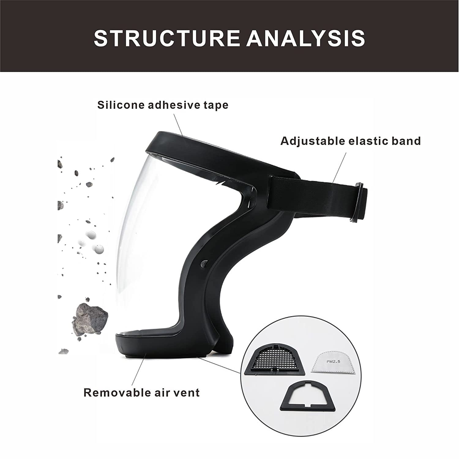 • 【Material and Design】--This face shield mask is composed of soft and comfortable silicone and highly flexible lenses, easy-to-set, adjustable elastic band assures comfortable, secure fit; Removable filter design,can use a variety of filter materials for protection.