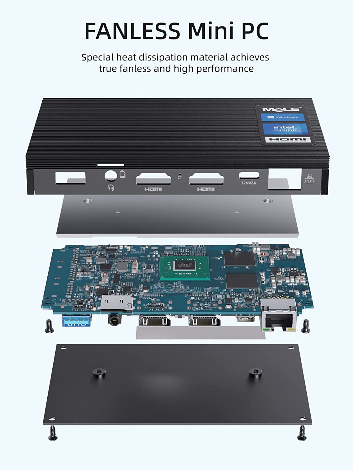【Fanless, low power consumption and extended service life】:Our MINI PC adopts high thermal conductivity engineering plastic fanless design, which doubles the effective heat dissipation area, making heat dissipation faster and more efficient, no fan, no noise, no dust. There is no need to worry about the failure of the fan causing the system to fail. Without a fan, our fanless MINI PC can effectively reduce consumption and extend the service life.supports run 7/24 hours.