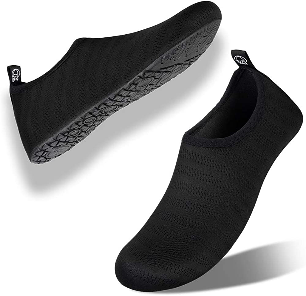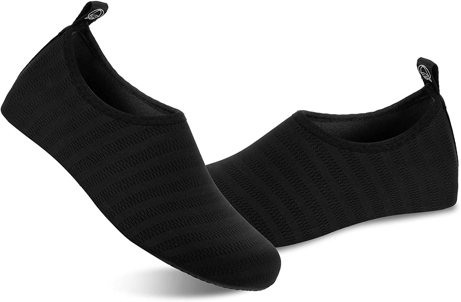 PERFECT MATERIAL: 92% polyester+8% spandex Upper. Breathable Ultra Light fabrics with fine stretch on uppers, flexible and comfortable. Smooth designed neck prevents chafing when wearing our water shoes. FOOT SAFETY -- Wearable and top-quality rubber sole, which protects your feet from being hurt by sharp objects. With an ergonomically molded, shock absorption performance cushioning separated protective toe.