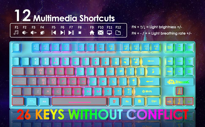 - 【88 Key Mechanical Feel Gaming Keyboard】26 conflict-free keys for ultimate Gaming performance. Featuring 12 Multimedia keys, Non-Slip Ergonomic, splash-proof Design with adjustable rear feet for the perfect typing angle, High-Speed USB cable with gold-plated corrosion free USB connector for a reliable connection which will stand up to fast hardcore gaming
