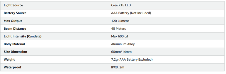 Notes: The above parameters tested by one AAA battery (900mAh) are approximate and may vary between lights, batteries and operating environment.