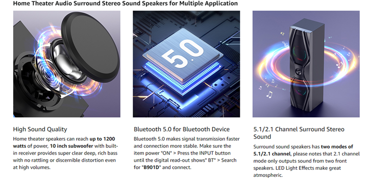 - Great LED Ambient Light Effect: The surround sound system speakers use high-quality materials, with LED lighting effect which makes full of atmosphere. The Subwoofer unit has 4 LED lighting modes: (blink to the beat, solid on, spectrum EQ analyzer, off).