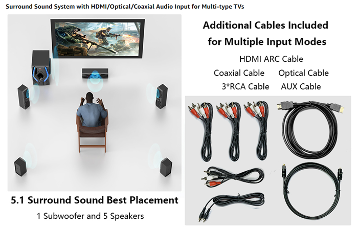 - Multimedia Support: The home surround sound speakers support various smart devices. 5.0 Bluetooth supports directly connecting with Bluetooth devices; It's also compatible with HDMI/OPT/COA/AUX/USB/DVD audio sound inputs. Additional cables include HDMI ARC Cable/Optical cable/Coaxial cable/AUX cable/RCA cable/Antenna cable supports any application in need