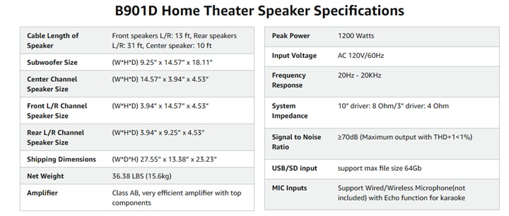 - Family Party Speakers System: The home theater system use high-quality materials and digital display function, also have FM radio function. USB drive/SD card slot(max file size 32Gb). 2 ¼” MIC Inputs with Echo function for karaoke. It's an ideal gift for family or friends.