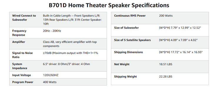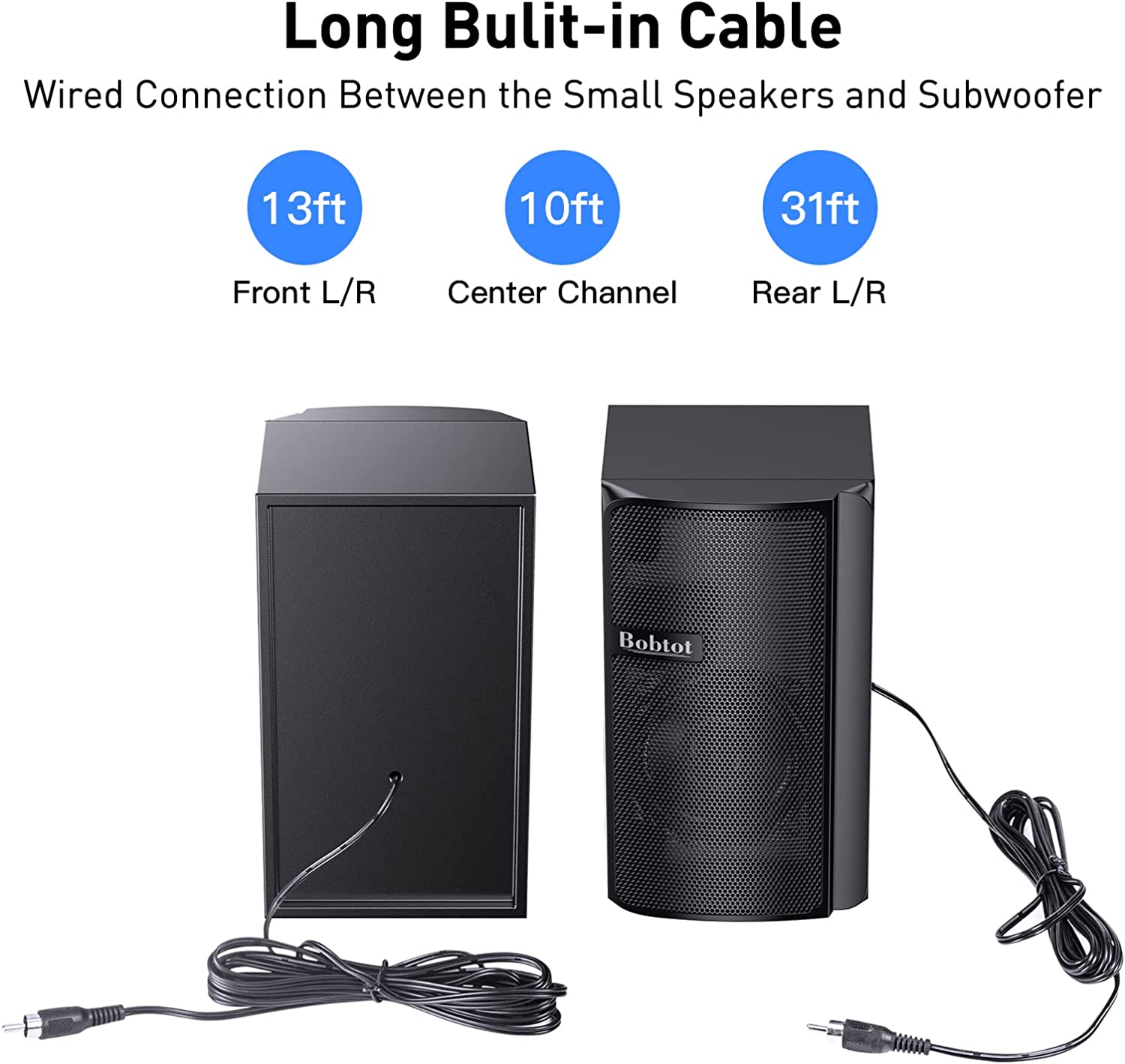 • 5.0 Bluetooth Connection & Wired Connection: The 5 speakers with built-in cable to connect with the subwoofer, long enough can be placed anywhere. Cable Length: Front Speakers L/R: 13Ft, Rear Speakers L/R: 31Ft, Center Speaker: 10Ft. Bluetooth 5.0 technology supports you to directly connect with Bluetooth devices