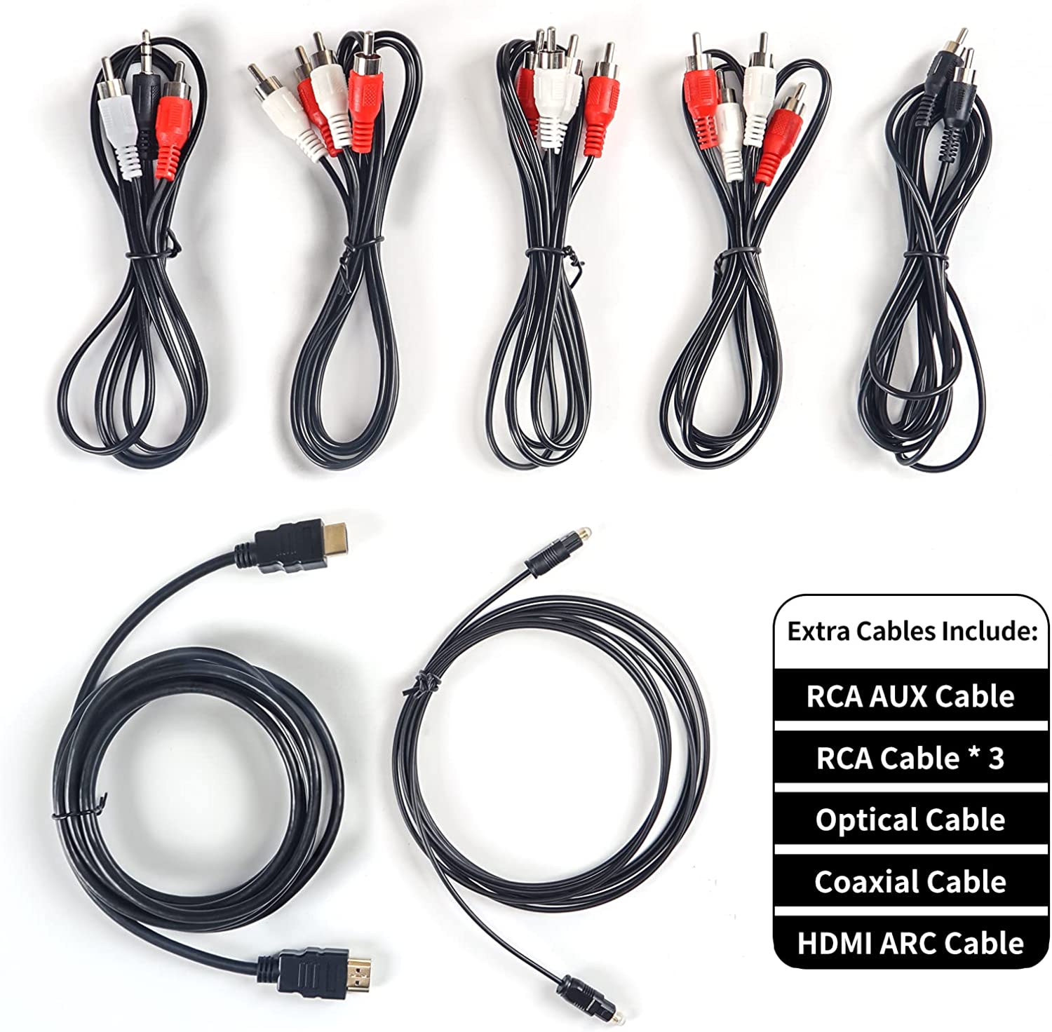 • Multimedia Support: 5.0 Bluetooth speakers can connect to various smart devices, and support multiple input modes like TV ARC/OPT/COA/AUX/USB/DVD, Additional cables include HDMI ARC cable/Optical cable/Coaxial cable/RCA cable/Antenna cable/Aux cable that can support any application in need