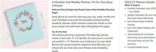 • July 2022 - June 2023 floral day planner with 12 months of monthly and weekly pages for easy academic planning and scheduling; 3 additional monthly pages (April 2022 - June 2022) are included