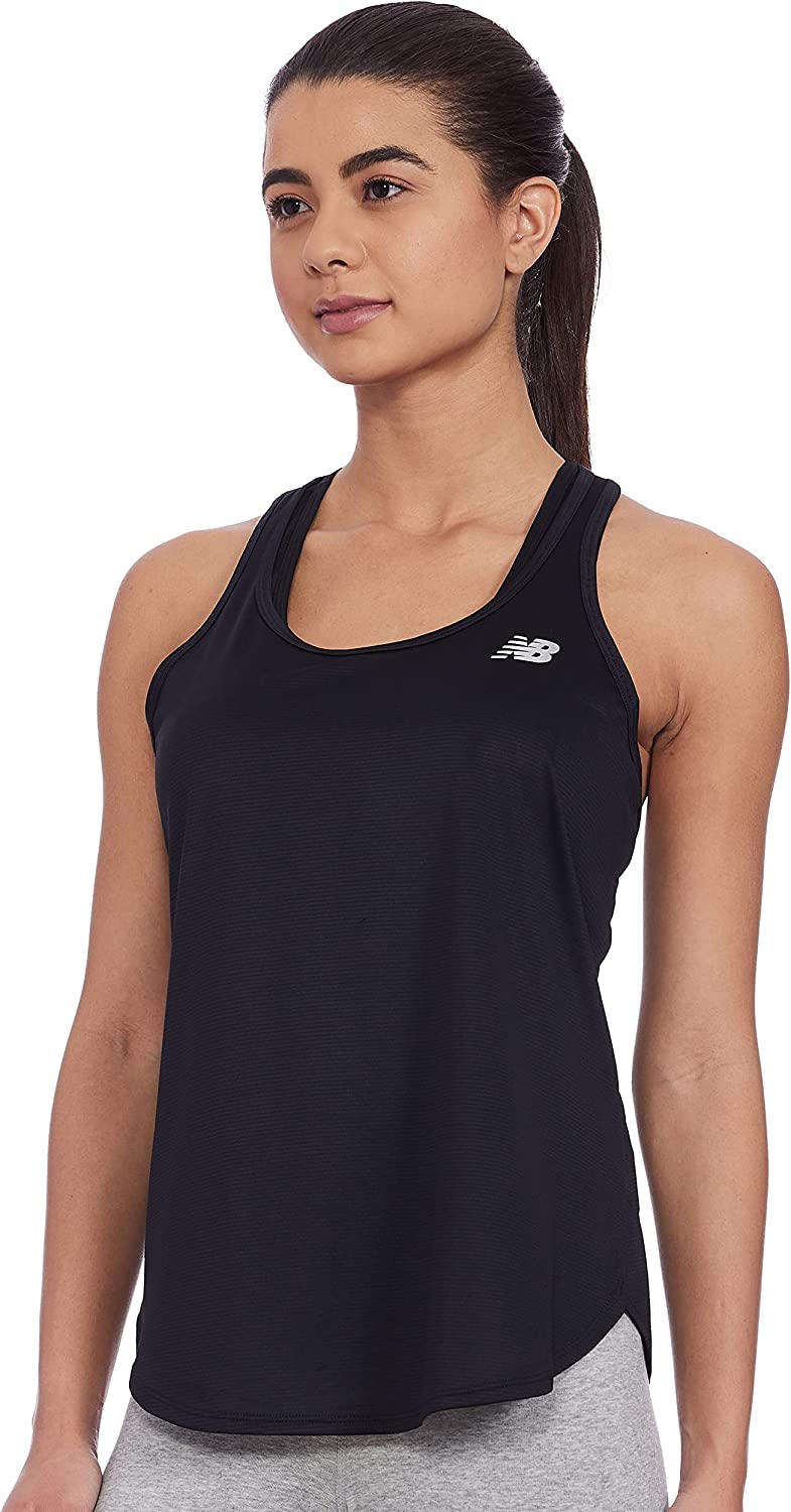 Womens New Balance Accelerate Tank :: Break a sweat in style. The tunic-length, athletic-fit Accelerate Tank features 100% poly pique plus reflective logo and tape. NB Dry moisture-wicking fabric releases moisture away from the body and is designed to help keep you dry.