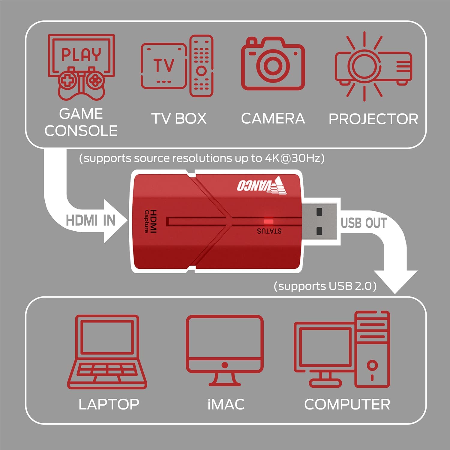 EASY PLUG AND PLAY: The Vanco HDMI to USB Capture Device does not need to install any driver and external power supply as it's a portable streaming capture video device