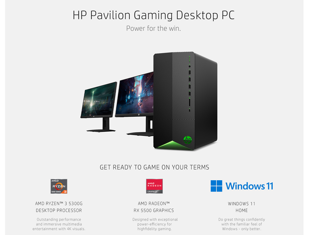 HP Pavilion Gaming Desktop, AMD Radeon RX 5500, AMD Ryzen 3 5300G Processor, 8 GB RAM, 512 GB SSD, Windows 11 Home, 9 USB Ports, Keyboard and Mouse Combo, Pre-Built PC Tower (TG01-2022, 2022)