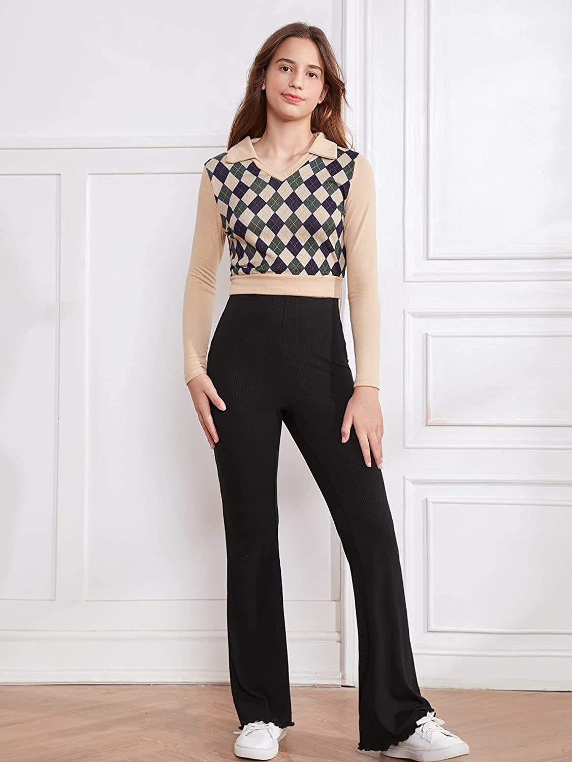 WDIRARA Girl's Elastic Waist Flare Leg Ribbed Knit Casual Stretch Long Pants