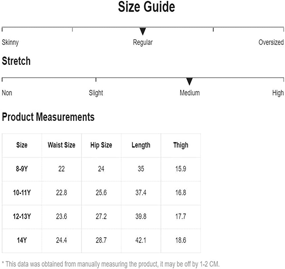 • Waist Size: (7Y) 19.9 inch; (8Y) 20.5 inch; (9Y) 21.1 inch; (10Y) 21.7 inch; (11-12Y) 22.8 inch
