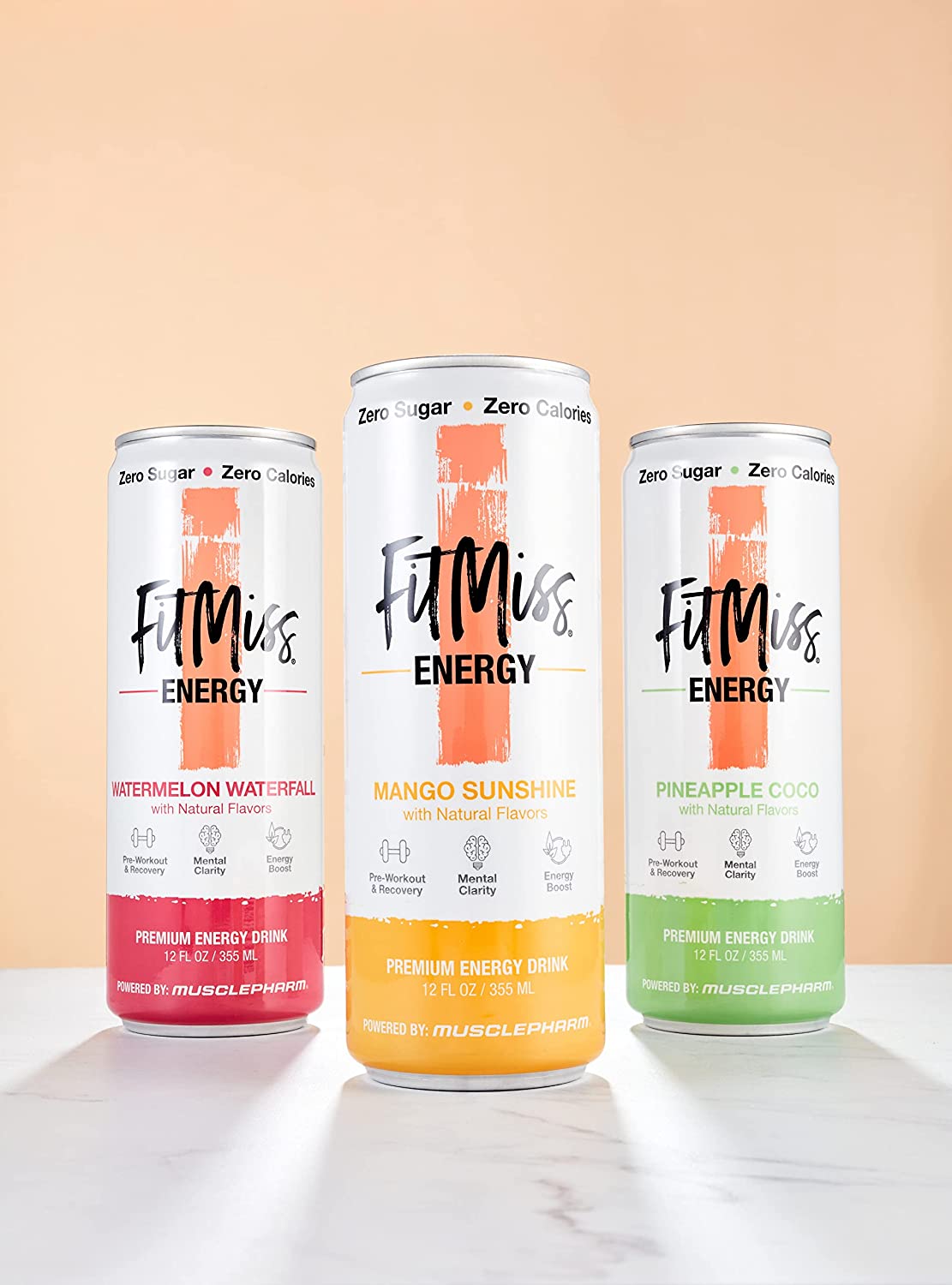 usclePharm FitMiss Energy Drink 12oz (Pack of 12) - Watermelon Waterfall - Sugar Free Calories Free - Perfectly Carbonated with No Artificial Colors or Dyes