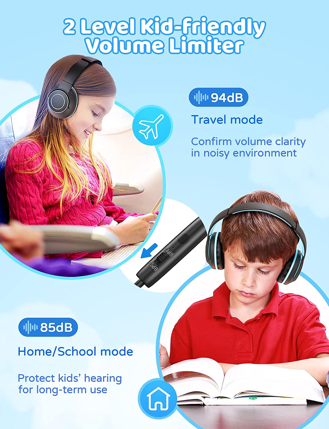 To Protect Kids' Hearing - This kids headphones provides 2-level volume limiter, which protects children's hearing from the harm caused by turning the volume up without any limit. Hence choose the 85dB volume limiter for daily use. If the child is in a noisy environment like car or airplane, please adjust the limiter to 94dB for crystal clear sound.