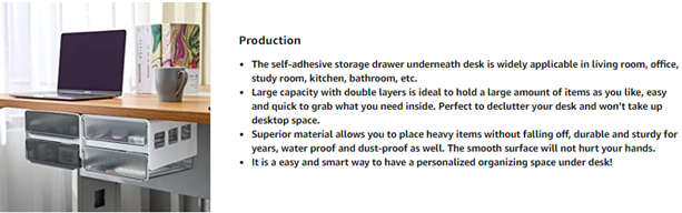 | Special Features | Under Mounted Drawer, Under Desk Drawer with Two Layers, Self-Adhesive, Hidden Drawer Under Table, Under Desk Drawer Slide-out |