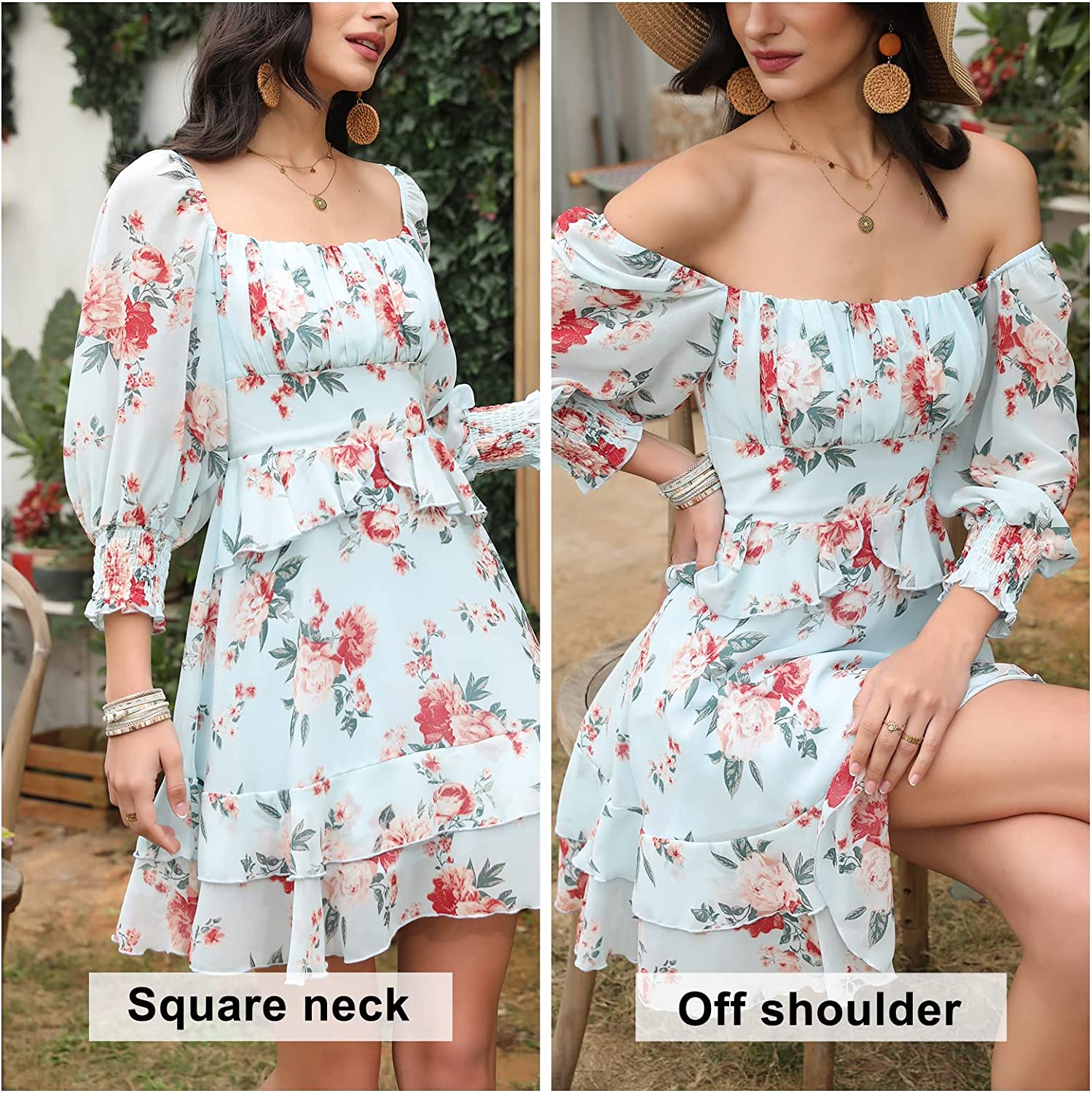 Design: 2022 summer dress for women, square neck, off shoulder, ruffle hem, 3/4 puff sleeve, mini length, tiered design, lining, floral print dress, smocked design, open back, frill hem, ruched bust, high waist, a-line silhouette.