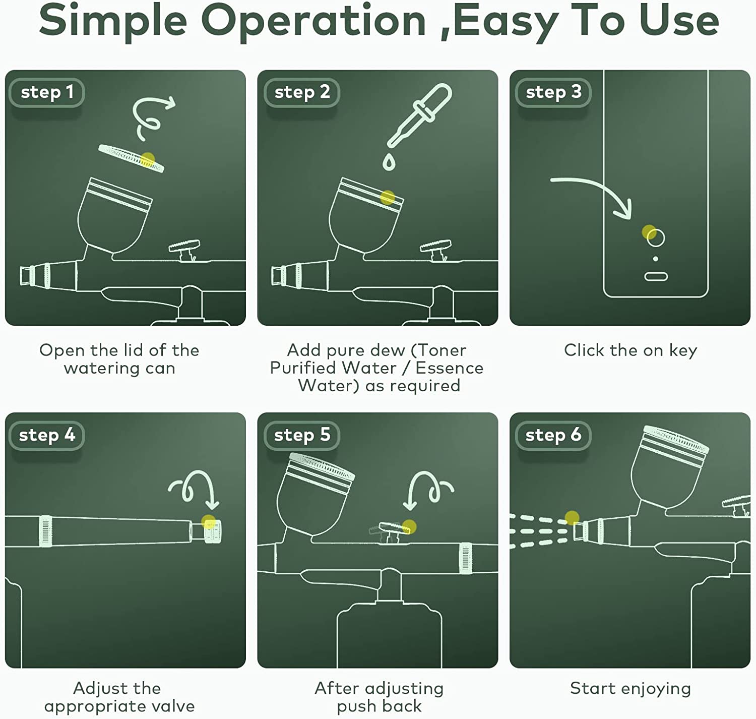 • 【FINE ATOMIZATION】Cordless airbrush kit can disintegrates diluted high viscosity water-based skin care products into nanospray, mix with oxygen, promote skin absorption, and achieve the effect of deep hydration.According to the fineness of the water mist, it is divided into three adjustable grades.