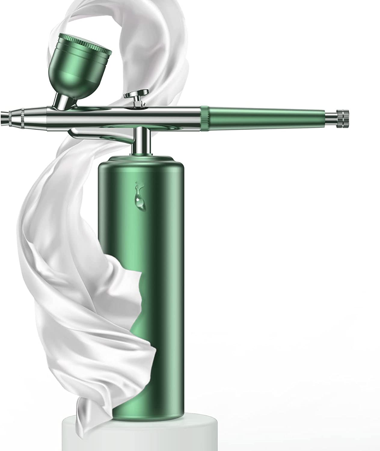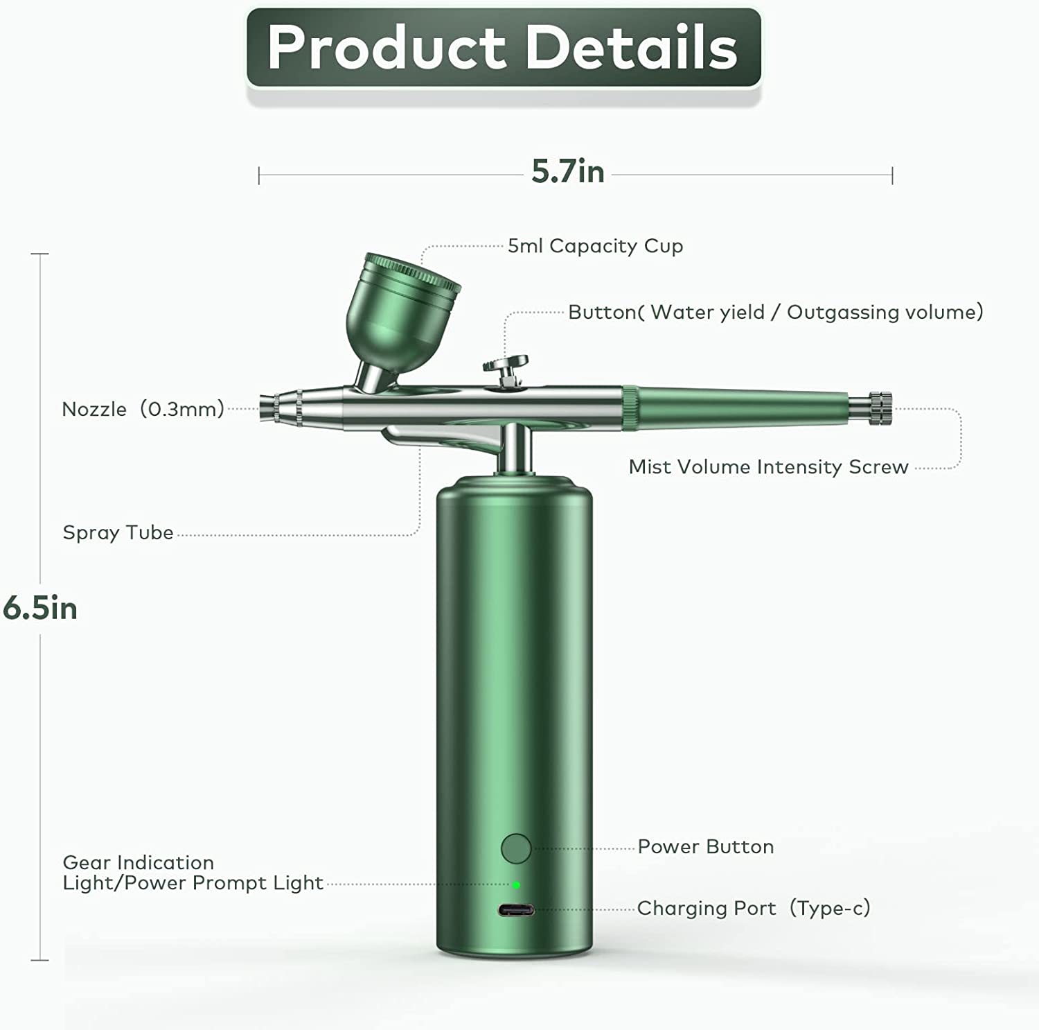 • 【METAL MATERIAL】Makeup Airbrush Kit is made of all metal material, which has a stronger body and better heat dissipation. The handle is frosted to improve slip resistance, and the emerald green airbrush presents the visual sense of gemstones under light and night.