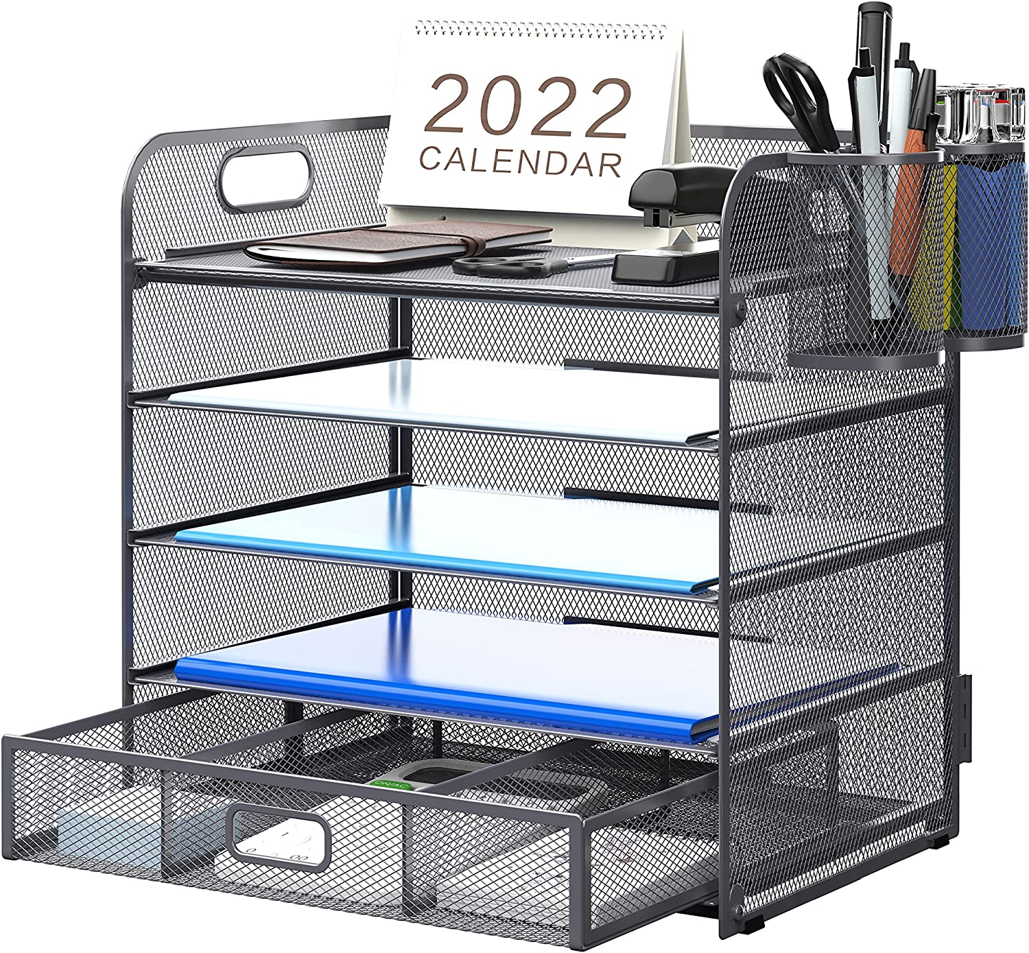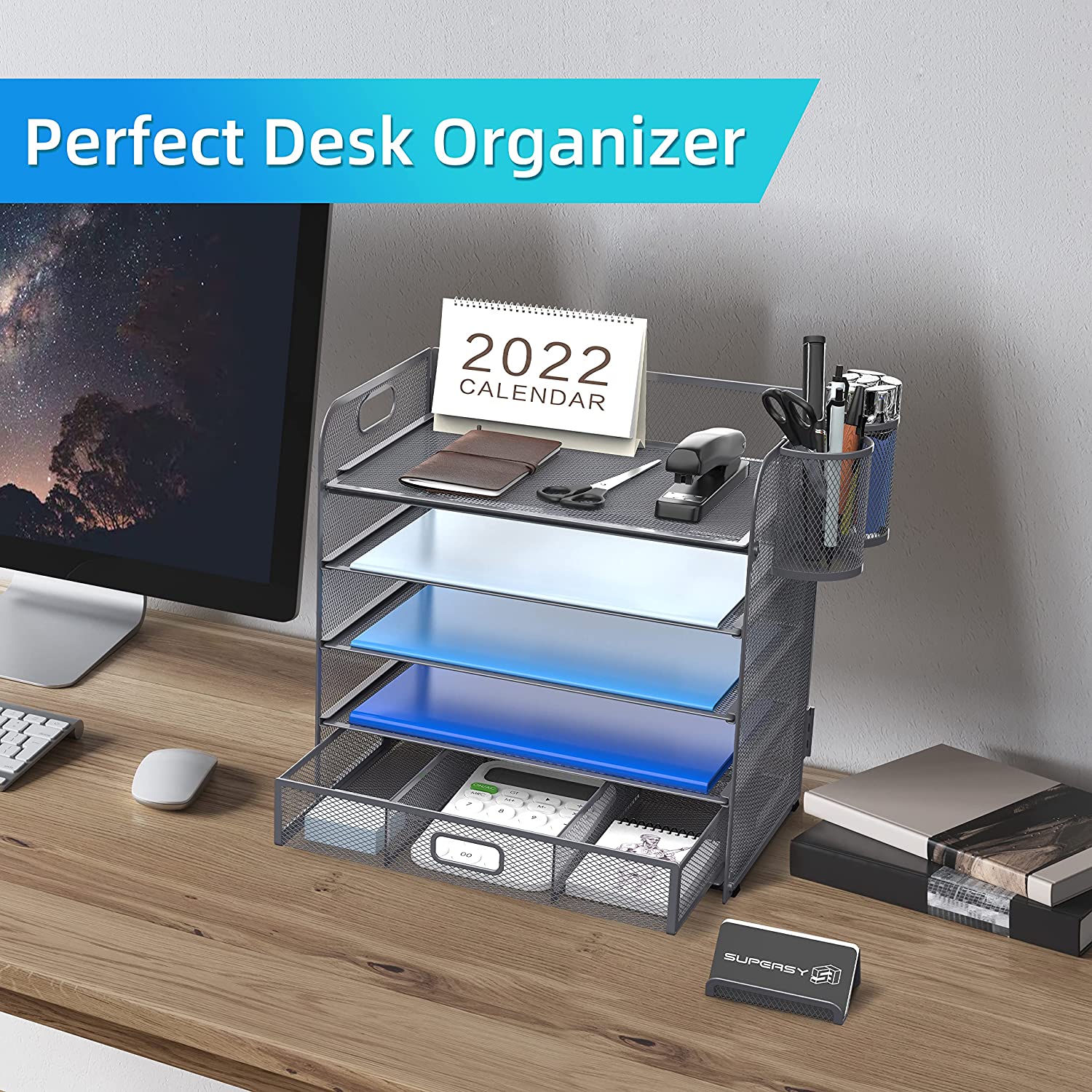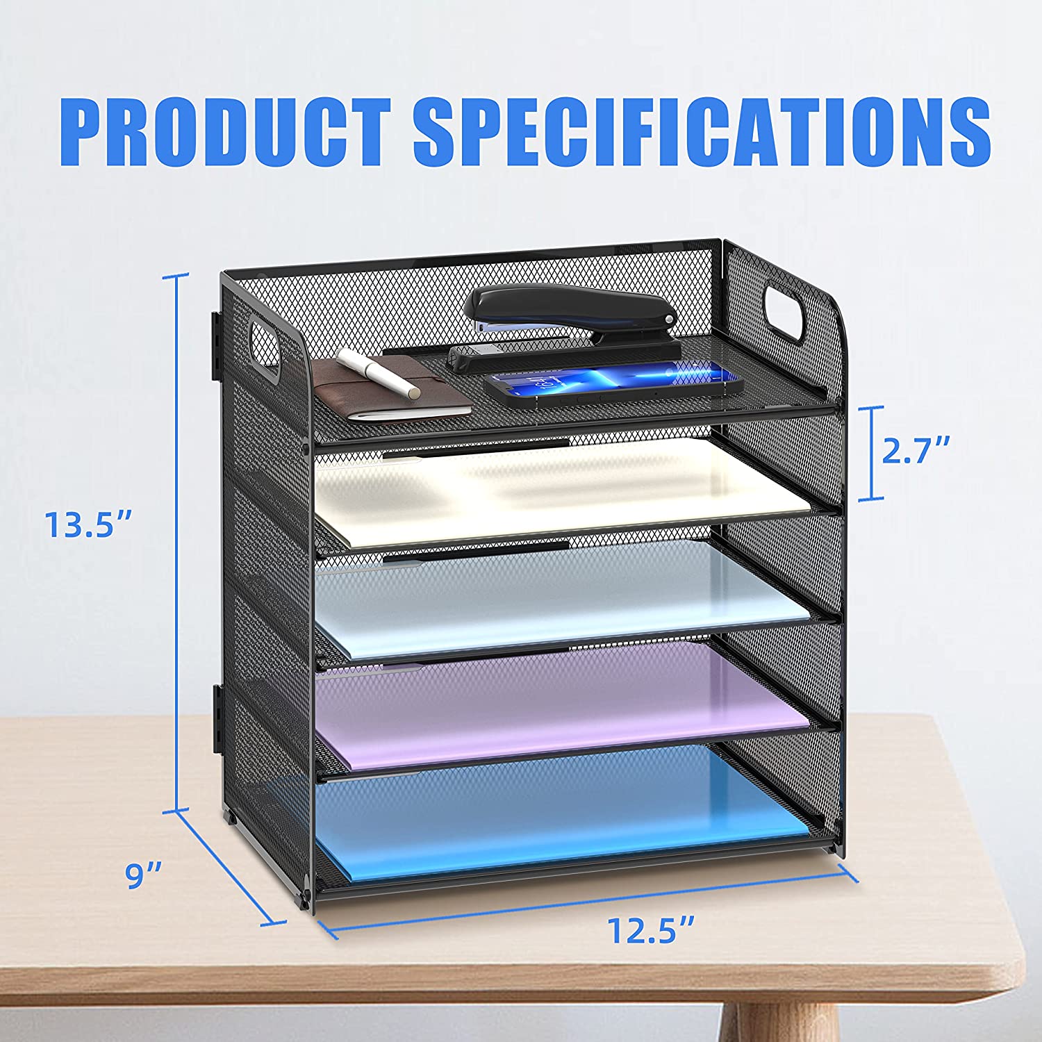 Supeasy 5 Trays Paper Organizer Letter Tray with Handle-Mesh Desk File Organizer,Black Paper Sorter Desk Organizer for Office,Home or School