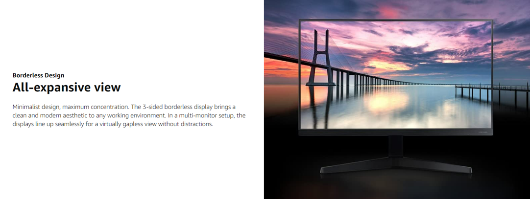- ALL-EXPANSIVE VIEW: The 3-sided borderless display brings a clean and modern aesthetic to any working environment. In a multi-monitor setup, the displays line up seamlessly for a virtually gapless view without distractions.Aspect ratio:16:9.Response time:5.0 milliseconds