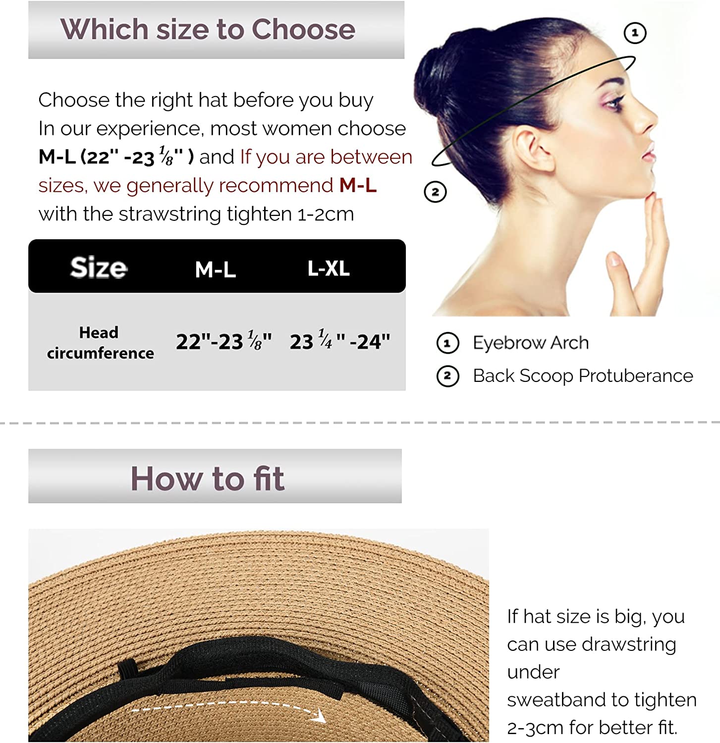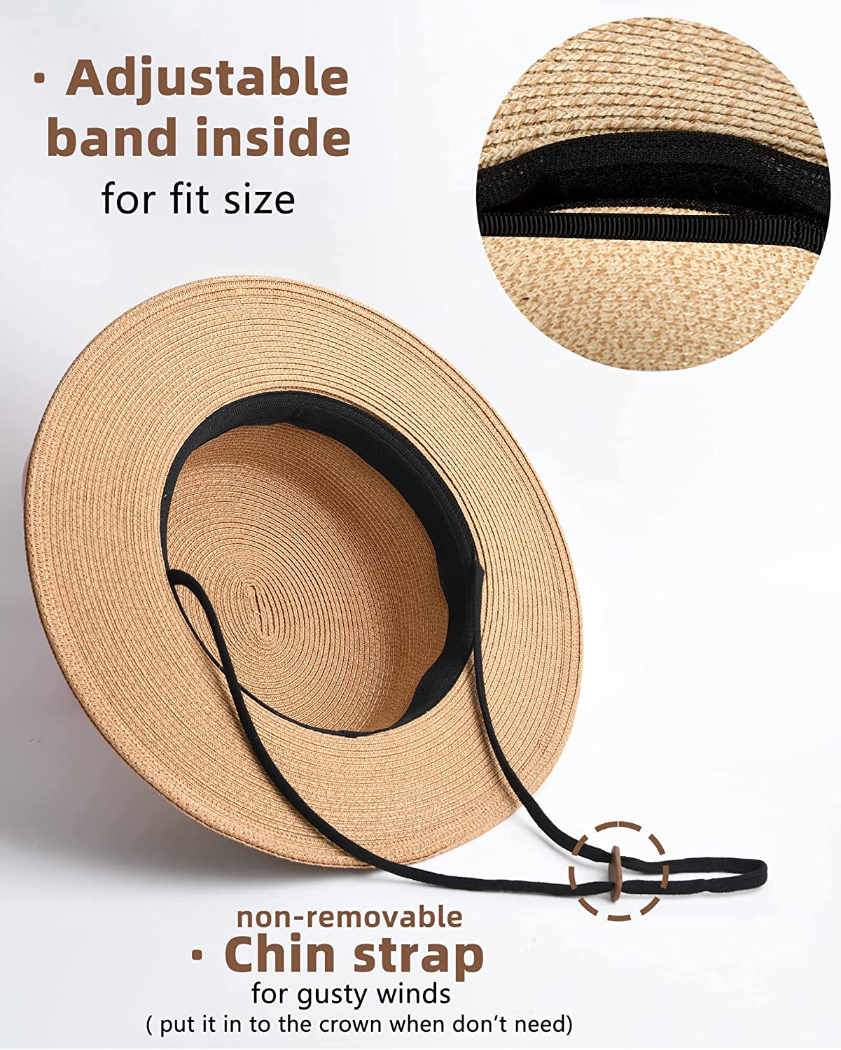 • Two Sizes to Fit Most: Two sizes are offered for this beach hats; Size M is recommended for head circumference around 22"-23 1/8" and Size L is recommended for head circumference around L 23 1/8"-24" ; If you feel it is too tight or too loose, you can adjust the size by inner velcro; Also, a detachable chin strap can hold it in place in blustery days,that you can keep the hat stable on top of your head.And Inner sweat band to help wick away moisture during the hot & humid summer seasons;